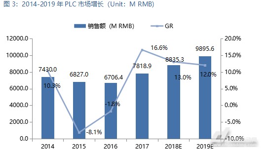 目前經濟形勢處於新常態,PLC市場在2017年出現回暖,增長率16.6%左右。