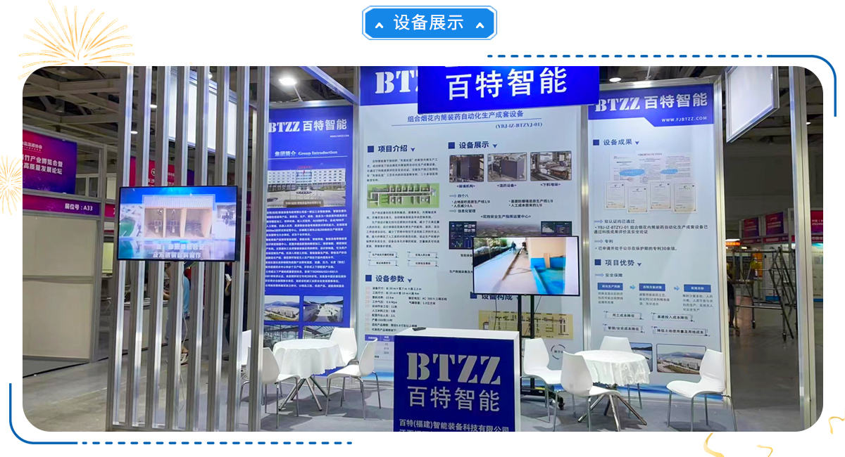 百特智能集團自動化產業集群成員即將亮相在A029/A030展位,現場展示“空炮餅上料區~亮珠添加區~亮珠輸送區~亮珠裝填~氧化劑裝填~還原劑裝填~混藥區~木屑裝填~固引劑裝填~收餅區~氧化劑添加區~還原劑添加區~木屑添加區~固引劑添加區~產後清水衝洗設備~產後衛生清理”的流程,百特智能集團將重點展示組合煙花內筒裝藥自動化生產成套設備領先技術和經典案例,真摯邀請您前來參觀和交流。