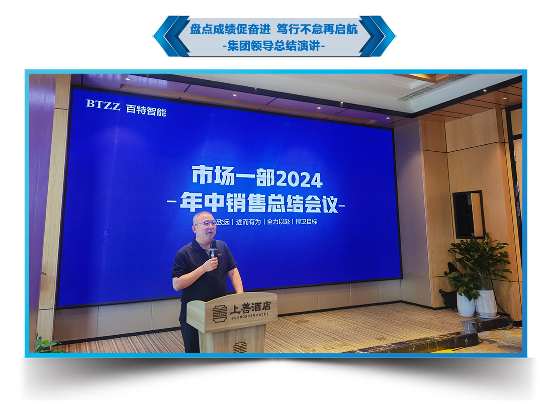 會議上,百特集團副總經理孫誌棟分析了2024年上半年公司整體經營情況、行業趨勢。以客戶為中心,以市場為向導,給出下半年的戰略目標、戰略途徑、工作思路,並逐一明確了市場部下半年的核心任務,為百特集團實現2024全年任務目標凝聚共識。