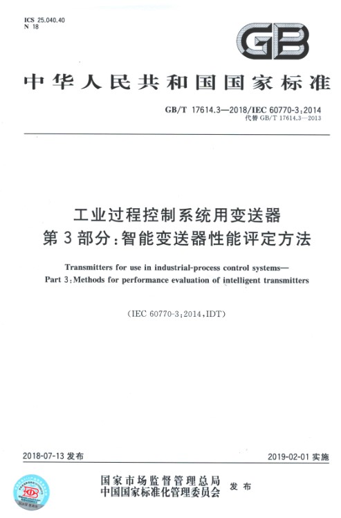 《工業過程控製係統用變送器 第3部分:智能變送器性能評定方法》GB/T 17614.3-2013自2014nianshishiyilai,bufenguidingyijingbuzaishiyongyumuqianzhinengbiansongqixingnengdepingding。weici,quanguogongyeguochengceliangkongzhihezidonghuabiaozhunhuajishuweiyuanhuiguikoushangbaole《工業過程控製係統用變送器 第3部分:智能變送器性能評定方法》GB/T 17614.3-2018。