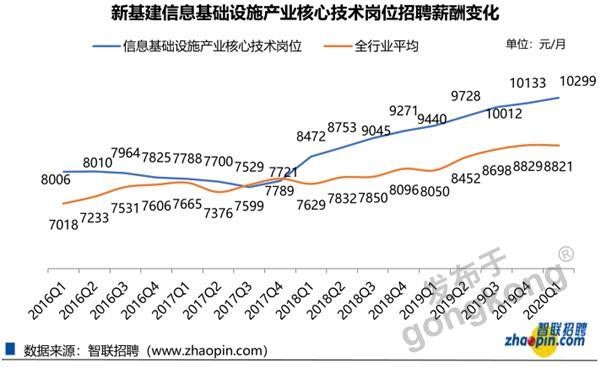 2020年一季度,信息基礎設施產業核心技術崗位的平均招聘薪酬為10299元/月,比全行業平均(8821元/月)高16.75%。5G 及人工智能崗位薪資更優。信息科學技術、計算機科學與技術專業畢業生當前收入最高,在萬元以上。