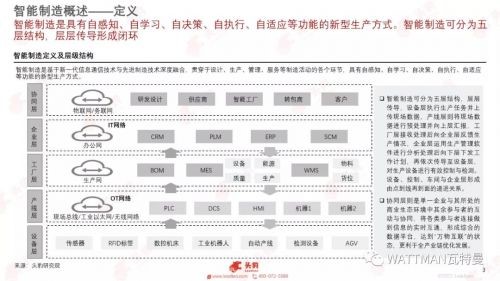 智能製造是具有自感知、自學習、自決策、自執行、自zi適shi應ying等deng功gong能neng的de新xin型xing生sheng產chan方fang式shi。智zhi能neng製zhi造zao可ke分fen為wei五wu層ceng結jie構gou,層ceng層ceng傳chuan導dao,設she備bei層ceng執zhi行xing生sheng產chan任ren務wu並bing上shang傳chuan現xian場chang數shu據ju,產chan線xian層ceng則ze將jiang現xian場chang數shu據ju進jin行xing預yu處chu理li並bing向xiang上shang層ceng彙hui報bao,工gong廠chang層ceng接jie收shou處chu理li後hou向xiang企qi業ye層ceng反fan饋kui生sheng產chan情qing況kuang,企qi業ye層ceng運yun用yong生sheng產chan管guan理li軟ruan件jian進jin行xing分fen析xi處chu理li後hou向xiang下xia層ceng下xia發fa工gong作zuo計ji劃hua,再zai依yi次ci傳chuan導dao至zhi設she備bei層ceng,對dui生sheng產chan設she備bei進jin行xing有you效xiao控kong製zhi與yu檢jian測ce。設she備bei、控製、車間與企業層形成由點到線再到麵的遞進關係。