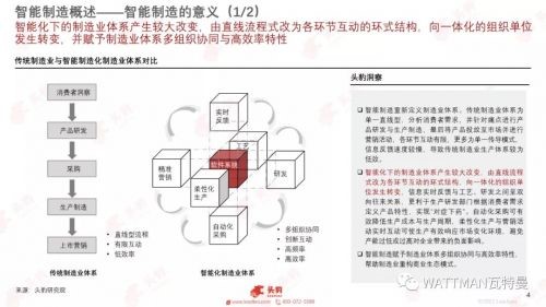 智能化下的製造業體係產生較大改變,由直線流程式改為各環節互動的環式結構,向一體化的組織單位發生轉變,信息實時反饋與工藝、研發之間呈雙向往來關係,更利於生產研發部門根據消費者需求定義產品特性,實現“對症下藥”。自zi動dong化hua采cai購gou可ke有you效xiao降jiang低di生sheng產chan成cheng本ben與yu生sheng產chan周zhou期qi,柔rou性xing化hua生sheng產chan與yu營ying銷xiao活huo動dong實shi時shi互hu動dong可ke使shi生sheng產chan有you效xiao響xiang應ying市shi場chang變bian化hua環huan境jing,避bi免mian產chan能neng過guo低di或huo過guo高gao對dui企qi業ye帶dai來lai的de負fu麵mian影ying響xiang。