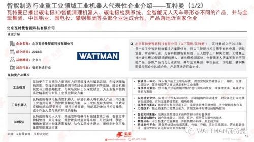 瓦特曼成立於2018年,是一家工業智能製造解決方案提供商,將人工智能技術應用於有色金屬、鋼鐵冶金、礦山等行業,為客戶提供智能製造、無人數字工廠解決方案。瓦特曼已推出碳電極3D智能清理機器人、碳電極檢測係統、全智能無人天車等形態不同的產品,多款產品均為世界級行業首創,並與寶武集團、中國鋁業、國電投、攀鋼集團等頭部企業達成合作,產品落地超百家企業。