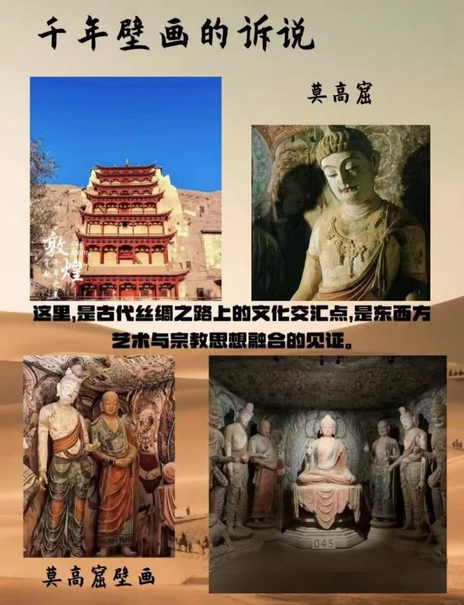佛(fo)光(guang)穿(chuan)過(guo)絲(si)綢(chou)之(zhi)路(lu)上(shang)的(de)風(feng)沙(sha),凝(ning)結(jie)了(le)人(ren)類(lei)的(de)虔(qian)誠(cheng)和(he)智(zhi)慧(hui)。風(feng)沙(sha)侵(qin)蝕(shi)的(de)懸(xuan)崖(ya)之(zhi)下(xia),每(mei)一(yi)顆(ke)沙(sha)粒(li),都(dou)承(cheng)載(zai)著(zhe)一(yi)份(fen)文(wen)明(ming)的(de)厚(hou)重(zhong)。行(xing)走(zou)在(zai)洞(dong)穴(xue)中(zhong),歲(sui)月(yue)從(cong)筆(bi)尖(jian)流(liu)淌(tang)而(er)過(guo)。北(bei)朝(chao)的(de)飛(fei)衣(yi)姿(zi)態(tai)優(you)美(mei),衣(yi)袂(mei)飄(piao)飄(piao),盛(sheng)唐(tang)的(de)佛(fo)像(xiang),低(di)垂(chui)著(zhe)眼(yan)簾(lian),微(wei)笑(xiao)著(zhe),掛(gua)著(zhe)如(ru)銀(yin)河(he)般(ban)的(de)項(xiang)鏈(lian)。五(wu)代(dai)的(de)供(gong)養(yang)人(ren)服(fu)飾(shi)華(hua)美(mei),眉(mei)間(jian)隱(yin)有(you)絲(si)綢(chou)之(zhi)路(lu)行(xing)商(shang)的(de)傳(chuan)說(shuo)。朱(zhu)砂(sha)、石青、金箔在斑駁之中,依然燦爛。佛祖拈花一笑,飛天彈起琵琶,《經變圖》中,蓮池漣漪。敦煌,不隻是一麵石牆,更像是一部以顏色繪就的宏大史詩。